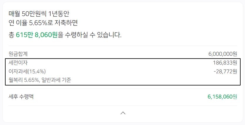 원금 세후이자 만기수령액 1년 수익률 6,000,000원 158,060원 6,158,060원 2.63% 청년응원특별금리 미적용 시 (최대 4.55%)
