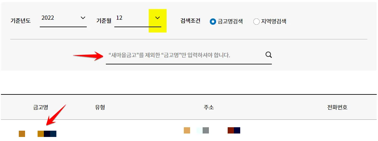 2. 조회를 원하는 새마을금고명을 입력한 후 돋보기를 눌러 검색한 금고명을 선택합니다. (검색결과가 없을 경우 기준월을 6월로 변경합니다)