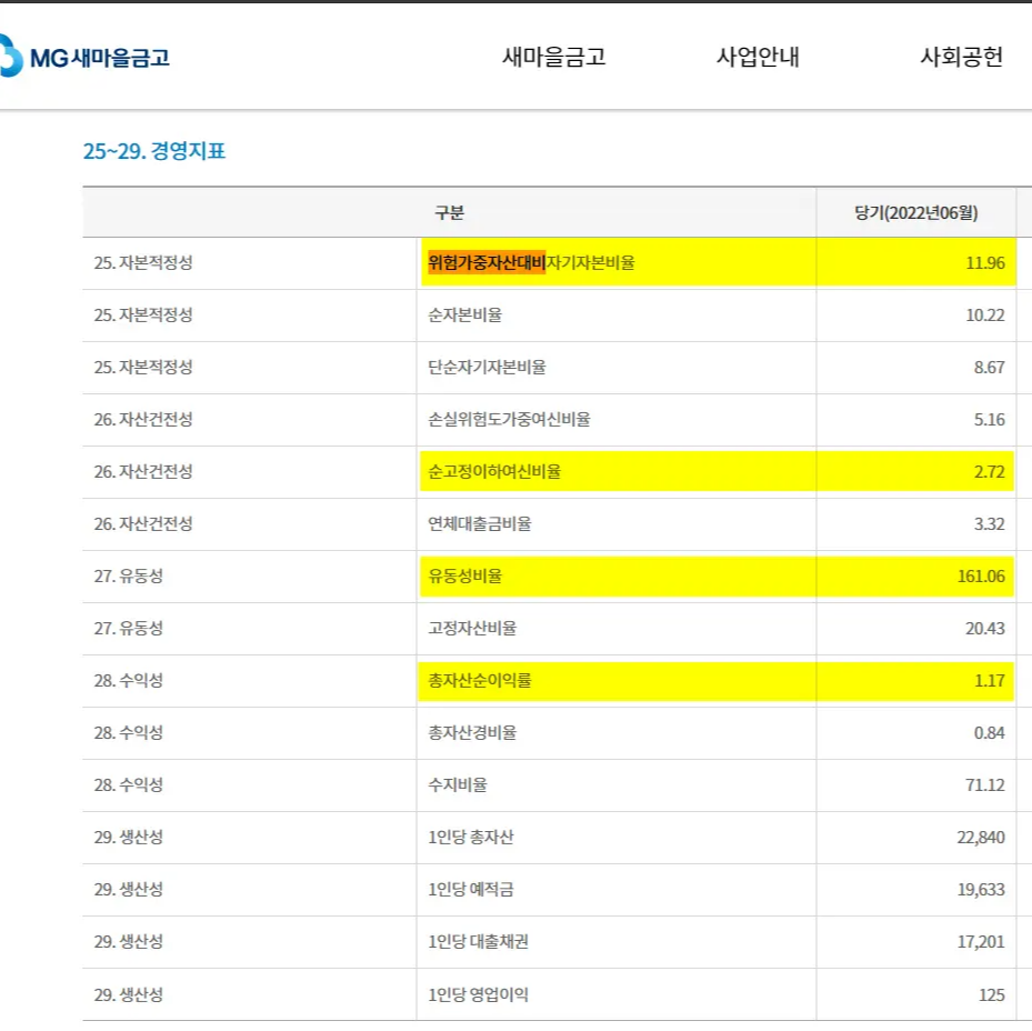 총 자산규모 최소 1천억 원 이상일 것. 기업자금대출 대출채권 현황에서 기업자금대출금이 많으면 위험 당기순이익 손실 없을 것 대출연체금비율 0%와 가까울수록 양호, 4% 이하 권유 4. 아래 내용 꼭~ 확인하세요