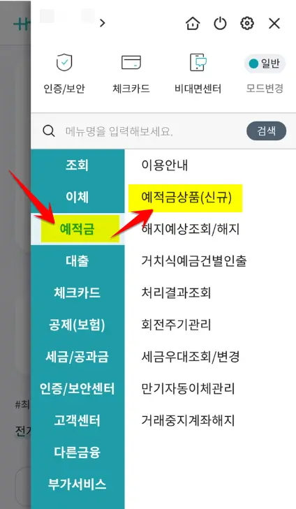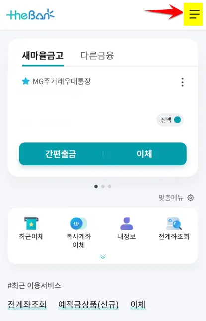 적금 개설 후 1개월 내 동일 금고 예금 추가 가입, 만기해지하거나 적금만기일까지 유지한 경우 :0.1%총 0.3% 우대 총 0.5% 우대 MG더뱅킹앱 설치 후 실행합니다. 로그인 후 우측 상단의 표시된 것을 눌러주세요. 예적금- 예적금상품(신규) 순서로 선택합니다.