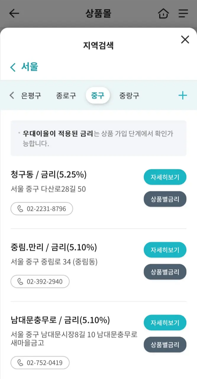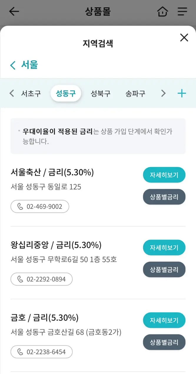 지역별로 검색한 경우 이렇게 그 지역 새마을금고의 금리를 조회할 수 있습니다. 한번 죽 둘러보면 내가 선택한 지역 새마을금고의 최고금리가 눈에 들어오실 텐데요. 제가 선택한 서울 지역 새마을금고의 최고 금리는 약 5%~5.3%였습니다.