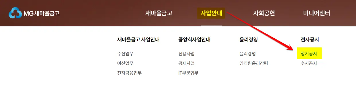 1. 새마을금고 홈페이지에서 사업안내-정기공시를 선택합니다.
