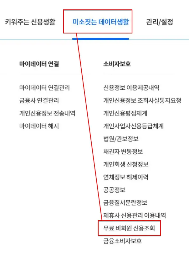 홈페이지 상단에서 미소 짓는 데이터생활을 선택한 후 무료 비회원 신용조회를 선택하면 됩니다.